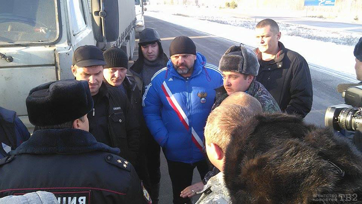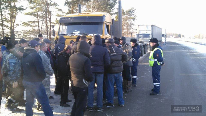 На дороге от Нового моста в сторону Кафтанчиково большегрузы остановили сотрудники ГИБДД. Полиция стала выписывать водителю, который ехал первым в колонне, штраф. Основанием для этого послужила слишком медленная скорость, создающая помехи на дороге. Однако остальные участники протеста вмешались, стали требовать, чтобы штраф выписали им всем. В итоге, колонна встала.