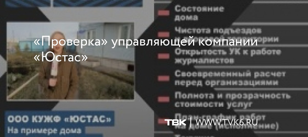 Новости ТВК продолжают «Проверку» управляющих компаний города Красноярска. УК «ЮСТАС» является монополистом в микрорайоне Ветлужанка. Его жители жалуются на плохое обслуживание домов.