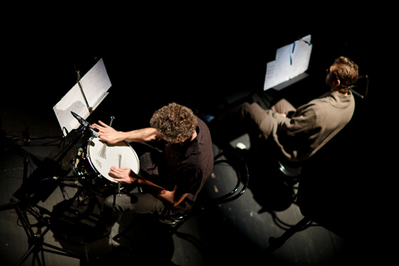 — Современный музыкальный язык очень сильно развился, он давно уже не только ноты. Он еще и картинка, и намерение исполнителя. Существует графическая партитура — как в пьесе у Марины Полеухиной для спектакля «В чаще»: в ней партия малого барабана изображена каракулями. Я вожусь с палочками на барабане, смотрю на партитуру Полеухиной и пытаюсь воспринять то, как она провела рукой по этой страничке. Она рисует мою траекторию движения метелочкой по барабану, я смотрю на этот графический материал и интерпретирую его с помощью собственного тела. Там нет ни одной ноты, но это неумолимый, насыщенный материал — так называемая графическая нотация.