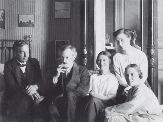 Крайний слева — Б.Н. Делоне, крайняя справа — его жена М.Г. Делоне, в центре — известный математик академик Я.В. Успенский, его жена и сестра (1924) Когда Лизочке минуло лет шестнадцать, она решила, что надо ехать в центр нашего русского мира, то есть в Петербург. Тогда, конечно, центр был Петербург, а не Москва: там царь жил, туда все средства тратились, Исаакиевский собор какой-то грандиозный, и Эрмитаж, и тому подобное. В Петербурге она поступила, конечно, на курсы, как всякая девочка, решила сблизиться с самыми интеллигентными людьми и сделалась поэтессой. О ней даже упоминает несколько раз в своих письмах Блок. И вышла замуж за такого Кузьмина-Караваева. Это такой плюгавый сынок профессора Кузьмина-Караваева, кадета известного. Но потом ей этот Кузьмин-Караваев показался худосочным слишком, и она сблизилась с Черновым, главным эсером, а главный эсер ее увез в восемнадцатом году в эмиграцию в Париж — и бросил. И она в Париже, эта Лизочка, начала зарабатывать тем, что расписывала дамские платья. Такая мода была: дама покупала шелковое облегающее платье, а художница ей расписывала узоры, на ней. Хорошо. А затем я думал, что ее уже больше и нету, этой Лизочки, на свете. И вдруг приехал в Советский Союз Андрей Жид. Ко мне звонок — это я еще в Ленинграде тогда был, это было, кажется, в тридцать втором году, — и некая появляется девица и говорит: «Я твоя племянница, я Лизочкина дочка, ты меня на руках носил». Я говорю: «Ничего подобного. А кто вы такая?» Говорит: «Я приехала прямо из Парижа в чемодане у Андрея Жида». Я говорю: «Ну и что же?» — «Можно у тебя жить?» Я говорю: «Конечно, нет. Как же я могу белоэмигрантку, мне неизвестную, принять? Да, может, это и не вы, а кто-то другой». Она говорит: «Я тебе принесу письмо от второго секретаря обкома ленинградского». Я говорю: «Это другое дело. Если принесете, то это будет другой разговор». Не принесла. Но, чтоб доказать, что это она, она мне такую фотографию дала, где действительно Лизочка — сидит в каком-то клобуке, а рядом монахини вокруг. Она сделалась аббатессой монастыря в Париже. И я опять о ней позабыл, решил, что все они померли, никого их больше нет. А потом как-то был как раз у вашего знакомого и моего большого приятеля Коли Анциферова — он говорит: «А знаешь ты, что случилось в Париже? Там такая...»