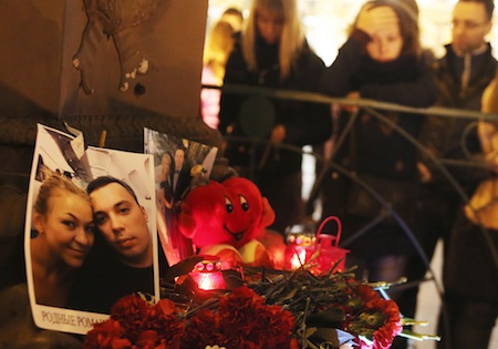 На фото: Россия. Санкт-Петербург. 1 ноября 2015. Цветы и свечи на Дворцовой площади в память о жертвах авиакатастрофы самолета Airbus A321. Самолет авиакомпании "Когалымавиа", выполнявший рейс Шарм эш-Шейх - Санкт-Петербург, на борту которого находились 224 человека, включая членов экипажа, разбился в 100 км от Эль-Ариша на севере Синайского полуострова утром 31 октября. Александр Демьянчук/ТАСС