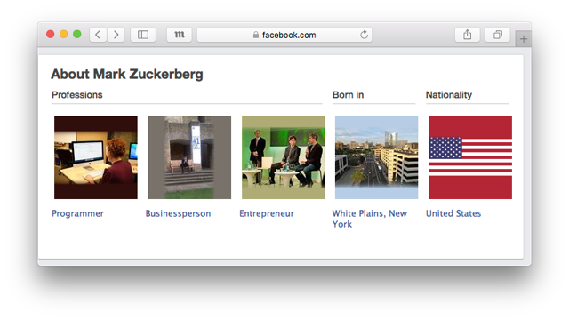 В социальной сети Facebook существуют автоматически сгенерированные страницы мест и известных личностей. В частности, существуют подобные страницы у Марка Цукерберга, Барака Обамы и основателя Google Сергея Брина.