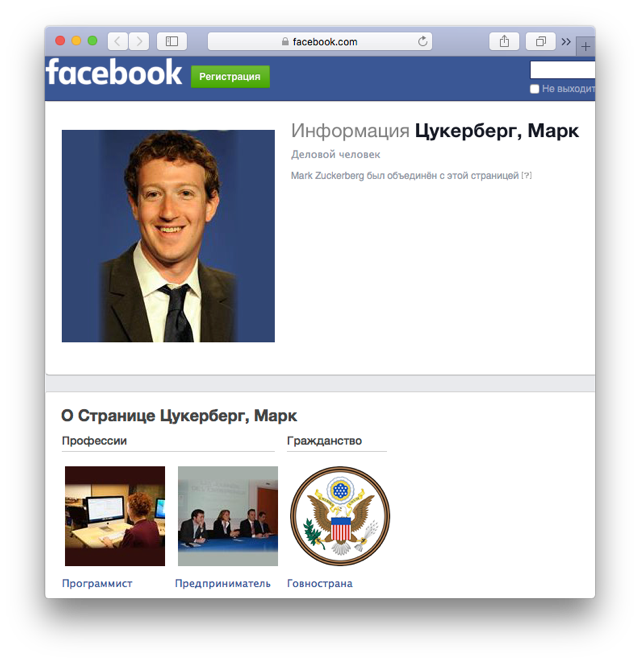 И на этой, автоматически созданной, странице указано, что гражданство Цукерберга — «Говнострана».