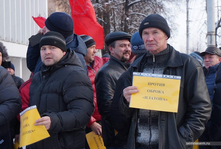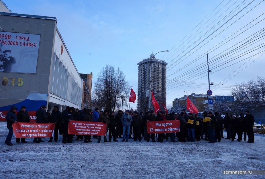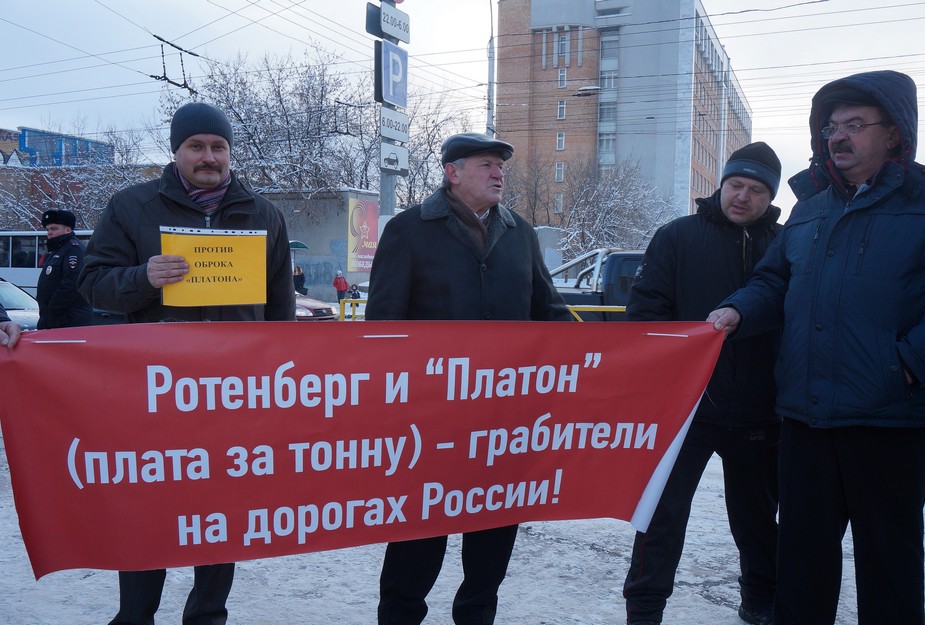 В 10 утра у задания администрации города собрались дальнобойщики. Они держали в руках плакаты с надписями «Ротенберг и „Платон“ (плата за тонну) — грабители на дорогах России!», «Медведев, ты нарушаешь 74 статью Конституции России и чинишь препятствия для свободного перемещения товаров!».