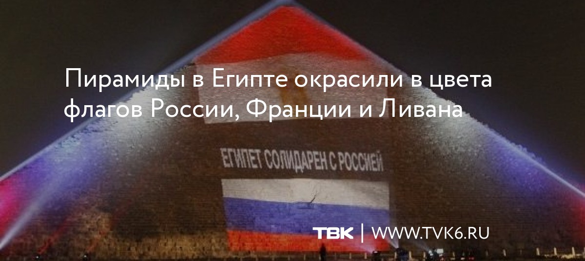 Древнеегипетские пирамиды окрасились в воскресенье вечером в цвета флагов России, Франции и Ливана, сообщает ТАСС.