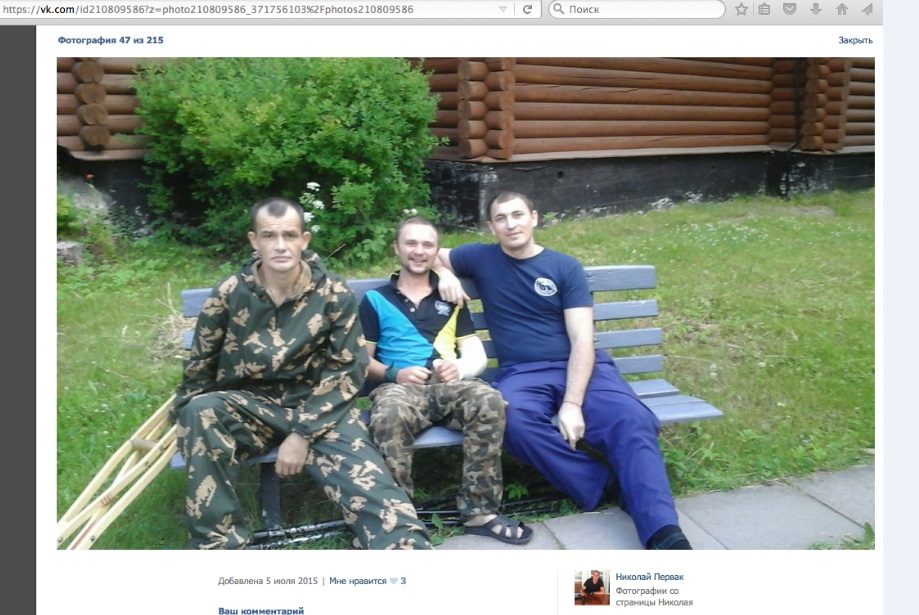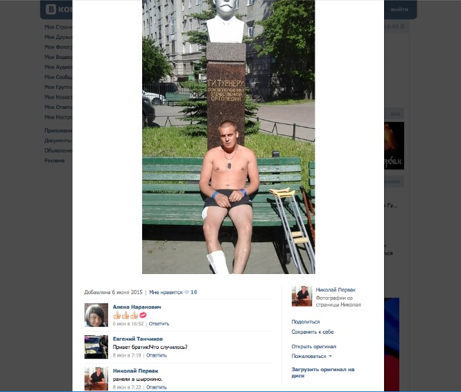 Активисты InformNapalm нашли и другие свидетельства того, что сепаратисты лечатся в российских больницах бок о бок с кадровыми российскими военными. Один из таких примеров – житель Мариуполя Николай Первак, активный сторонник "Новароссии" – именно так несостоявшееся квазигосударственное образование названо в его профиле в сети "ВКонтакте" (сохраненная копия). Он был ранен в бою против украинской армии в районе населенного пункта Широкино в начале 2015 года, а летом, как следует из фотографий в его профиле, уже залечивал раны в клинике военной травматологии и ортопедии имени Генриха Турнера в Санкт-Петербурге. Одна из фотографий Первака сделана во дворе больницы на фоне памятника самому Турнеру: