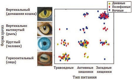 Чтобы выяснить, для каких именно, исследователи проанализировали сведения о форме зрачка, суточной активности и способе питания 214 видов животных: австралийских змей, описанных в предыдущем исследовании, представителей семейств кошачьих и псовых, гиен, виверровых, парнокопытных и непарнокопытных. Они обнаружили достоверную связь между формой зрачка и экологической нишей животных (рис. 1). Горизонтальные зрачки почти всегда принадлежат травоядным пастбищным животным, таким как овцы и козы, у которых глаза расположены по бокам головы. У полифазных хищников, преследующих жертву, зрачки круглые. Животные с вертикально вытянутыми зрачками, как правило, охотятся из засады, и глаза у них расположены фронтально.