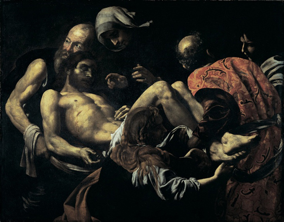 Конечно, все эти ярлыки надо применять с большой осторожностью. Если мы скажем, что композиция эта отдает реализмом или какой-то такой натуральностью, конечно, так говорить нельзя. Когда я рассказывал эту экскурсию школьникам, они мне сказали, что картина круглая, имея в виду, что эта композиция так вот подчинена некоторому замкнутому движению. Караччоло — тоже поздний маньерист, и когда Караваджо приезжает в Неаполь, в нем еще сохраняется такая вот геометрическая идея — заставлять фигуры двигаться по спиральной или синусоидной линии, которая характерна для поздних маньеристов. Видите, они все так наклоняются к телу Христа, создают какую-то странную опять же театральную постановку, которая уходит в темноту. И в то же время в этом очень много подсмотренного, очень много натурального — в том, как эти лица, спиной сидя к изображению, к зрителю, производят на нас такое странное впечатление.
