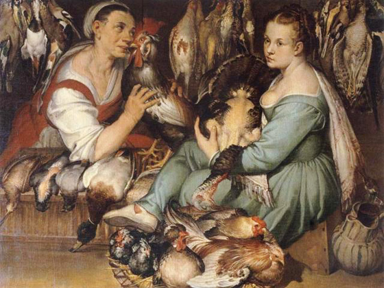 © Фонд Роберто Лонги Бартоломео Пассаротти «Торговки птицей» Она больше отдает северной какой-то фламандской, голландской традицией всяких натюрмортов с дичью, которые появятся потом и у которых в XVI столетии есть предшественник — Иоахим Бейкелар. Пассаротти сделал большой цикл, четыре существуют вещи: одна у Лонги, другие в итальянских музеях различных, там еще «Мясной рынок», «Рыбный рынок», всякие такие обыкновенные вещи. Она здесь висит потому, что натюрморт не напишешь иначе, как внимательно разглядывая эту самую курицу, которую приходится писать. Или вот этого вот воробья, которого Пассаротти (по-итальянски воробей — это «пассаро») включал в качестве своего автографа, в качестве как бы подписи, что, дескать, я, Пассаротти, написал эту картину.