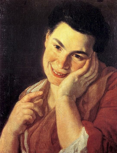 Это две парные картины Гаспара Траверси, изображающие школу мальчиков и школу девочек, почти карикатурные, почти сатирические изображения, на которых описаны театральные взаимоотношения этих мальчиков и девочек. Кто-то на кого-то ябедничает, кто-то за кем-то подсматривает, кто-то целует руку учителю… Но в этом во всем очень много натурной наблюдательности, хотя есть и театрально-постановочный момент, как, например, в этой служанке. Она, на самом деле, не просто служанка, а так называемая Фантеска, это роль в итальянской комедии масок, комедии дель арте. И, с одной стороны, это роль, это маска, а с другой — это, очевидно, некий портретный тип, писанный с натуры. И это важно.