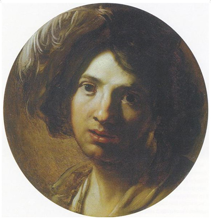 © Фонд Роберто Лонги Бартоломео Манфреди «Продавец фруктов» Сюда же, к этой традиции, примыкает и «Голова юноши» Николо Реньери, как его называли на итальянский манер, или Никола Ренье, как на самом деле его звали, потому что он был француз. Видите, снова такой взгляд, но не в зеркало, как это было в «Мальчике с ящерицей»; такой очевидно портретный тип, данный в контрастном светотеневом решении, которое выделяет половину лица, и, безусловно, в этом есть какая-то выхваченность, сиюминутность, какая-то такая моментная… не фотография, конечно, но, в общем, похожее впечатление.
