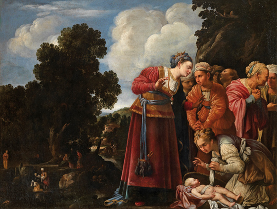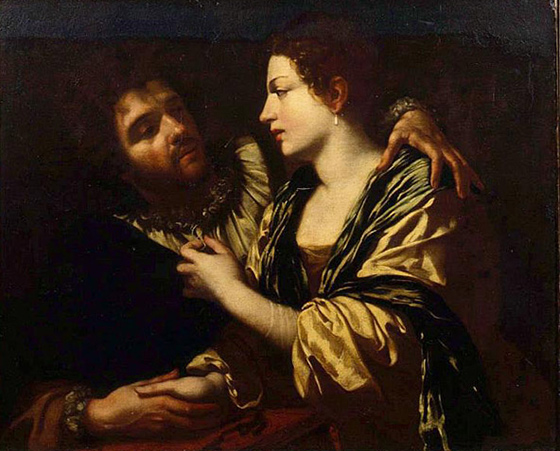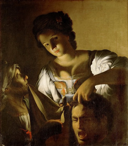 © Фонд Роберто Лонги Сарачени «Нахождение Моисея» Теперь переходим в ту сторону, посмотрим на Сарачени чуть позже. Внезапно во всей этой итальянской живописи около Караваджо становится темно, и освещение приобретает совсем не тот характер, который принято и привычно глазу было видеть чуть раньше. Здесь изображена, собственно, Юдифь с головой Олоферна, известный библейский сюжет, как она убеждает этого врага израильского народа, отрезает ему голову, потом приносит вместе со служанкой, которая часто изображается с ней вместе. Сюжет взят из Караваджо, потому что есть его работа на ту же тему, она висит в Галерее Барберини в Риме. И очень часто близкие и дальние последователи мастера повторяли буквально это сюжет, меняли немножечко положение фигур, интерпретировали, но всегда эта Юдифь со служанкой остаются. Существует целая группа таких работ.