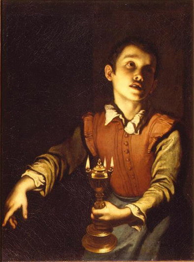 © Фонд Роберто Лонги Франческо Курради «Мальчик со светильником» Здесь еще одна важная для нашей экспозиции работа, потому что очевидным образом этот «Апостол Иаков» продолжает тот ряд, который мы только что видели. Эта картина, появившаяся в музеях благодаря коллекционеру Феликсу Евгеньевичу Вишневскому, была только недавно отреставрирована, почищена, и сегодня даже итальянцы соглашаются с тем, что она, скорее всего, продолжает тот же самый ряд и является одной из вот этой серии, в которой, как вы догадались, было 12 картин, а не 5, как у Лонги. Хотя, безусловно, она больше их пострадала от времени, потемнела. Тут очевидная вещь — эта диагональ, вот эта фронтальная такая маска, уши, нос и руки, всякие такие подробности, по которым, собственно, и отличаешь одного от другого.