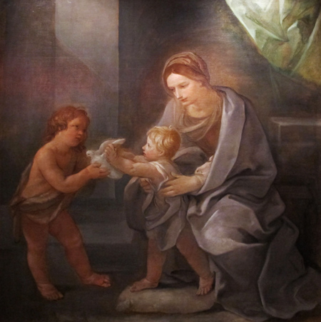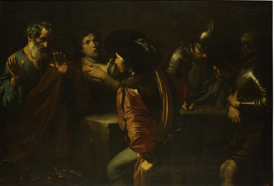 Здесь самое большое полотно Валантена де Булоня, одного из лучших французских караваджистов, если не самого лучшего, который, поучившись в Риме, потом, собственно, никогда не уедет, так там и останется, в отличие от Симона Вуэ, который вернется во Францию и там уже будет продолжать это движение. Это история не только о святом Петре, не только сюжет, продолжающий отречение Петра, — там про петуха, про то, что он должен на заходе солнца был отречься трижды. Вот, собственно, служанка, которая его узнает в толпе, а он говорит: «Нет, никакого признания не было». Такая простонародная постановка вопроса, когда вокруг еще есть разного рода участники, одетые в костюмы, надо сказать, XVII века; все это переносит нас и отдает очень сильно теми ранними историями о самом Караваджо, который водил, скажем, гадалок с улицы, чтобы писать их в мастерской, говоря, что нет ничего лучше, чем писать уличных героев.