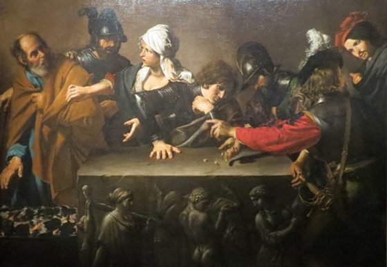 Тут немножечко более слабая работа. Видите, какие зеленые лица, это связано со смытием верхнего слоя и деградацией красного пигмента. Это Маттиа Прети, снова неаполитанец. Абсолютно такое же устройство, такие же полуфигуры сидят вокруг стола. Это все совершенно типично, и те, кто был в Эрмитаже, могли видеть повторение этой работы, которое немножечко даже выше по качеству, а парная к ней картинка, хранящаяся, как ни странно, в музее Ростова-на-Дону, изображает как раз такого рода игроков в кости, и все это становится, в общем, таким уже общим местом караваджовской стилистики: сюжет, в который одни художники что-то вносят от других и копируют уже в дальнейшем разное. Полуфигуры в темноте. Не всем это нравилось, не все к этому относились положительно. Говорили: кому недоставало ума писать полуфигуры в темноте? Половина работы, собственно, остается сделанной, а остальное можно так вот быстренько увести в тень.