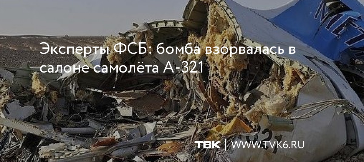 Эксперты ФСБ пришли к выводу, что бомба, взрыв которой привёл к разрушению А-321 над Синайским полуостровом, была заложена под пассажирским сиденьем в салоне лайнера, сообщает «Коммерсантъ».