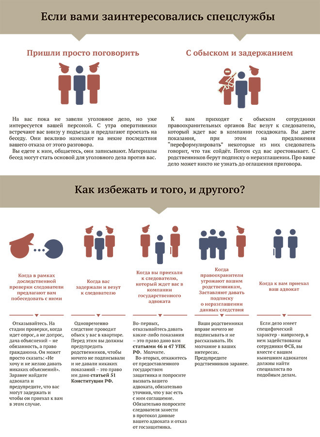 Это следует сделать, как только вы понимаете, что против вас могут возбудить уголовное дело. Договоритесь с ним, что в случае чего он приедет к вам на выручку. Кроме того, попросите его сразу найти специалиста по делам, которые ведет ФСБ: здесь нужен опытный человек в таких вопросах.