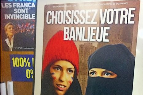 Предвыборная агитация «Национального фронта» Марин Ле Пен. Справа плакат, который многие во Франции сочли провокационным и расистским: «В каком пригороде вы хотели бы жить — выбирайте»