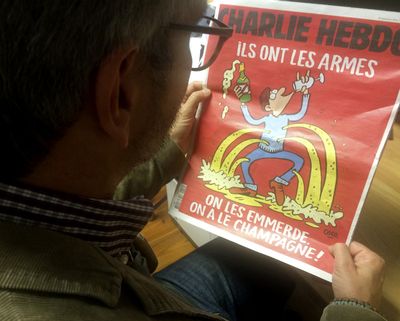 Не изменяет себе и широко разрекламированный МИДом и парламентариями в России Charlie Hebdo. «У них есть оружие — да ну их к черту, у нас есть шампанское!», гласит надпись на красном фоне обложки Charlie, где посреди страницы у изрешеченного пулями человечка струится изо всех дыр шампанское. В своей редакционной колонке Лорен Суриссо, который пишет под псевдонимом Рисс, сравнивает парижан 2015 года с лондонцами 1940-го, жившими под немецкими обстрелами. Нельзя поддаваться страху, уверен автор. «Не уступить ни одну из наших свобод: смеяться, пить, есть, танцевать, петь, улыбаться, слушать музыку, гулять, ругаться, заниматься любовью, спорить, учиться, ходить в кино», — призывает другой карикатурист со страниц Charlie Hebdo.