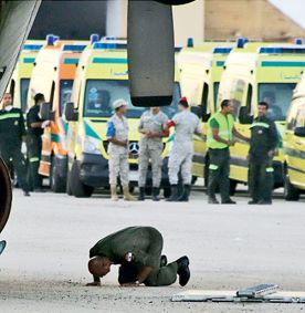 Египетский солдат совершает молитву, пока его коллеги ожидают прибытия вертолета с телами погибших пассажиров А321, Египет, Суэц, 31 октября 2015 года