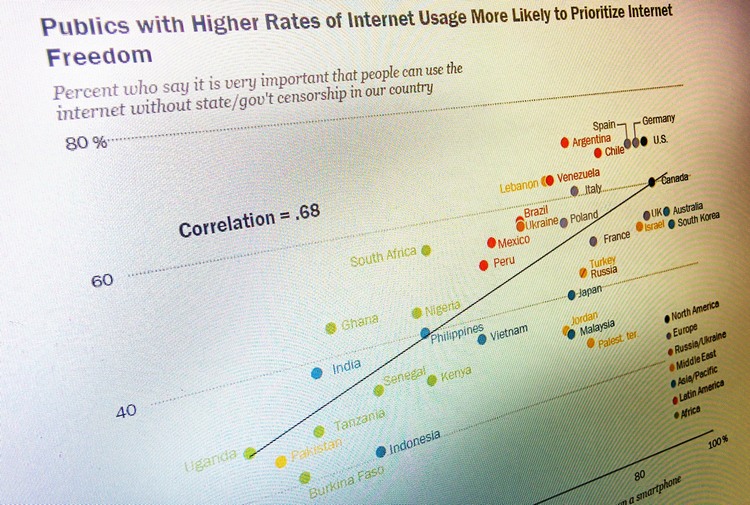 Прослеживается четкая корреляция между процентом пользователей интернета и теми, кто считает свободный интернет очень важной ценностью. Это позволяет предположить, что по мере распространения Сети по планете в ближайшие годы, запрос на свободу в киберпространстве также будет расти.