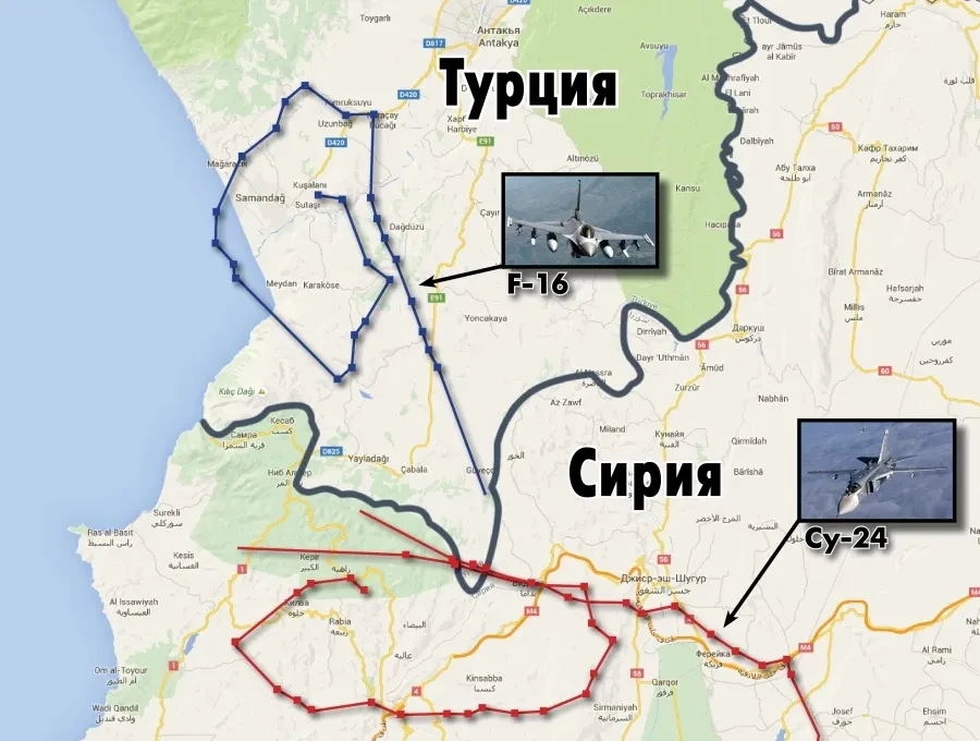 Если наложить траектории на карту, российский самолет в момент атаки действительно находился над территорией Турции, которая вклинивается в территорию Сирии своеобразной «кишкой» шириной чуть больше двух тысяч метров.