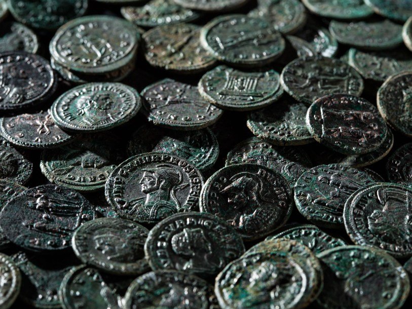 Швейцарский нумизмат Хьюго Допплер осмотрел 200 уже очищенных от грязи монет и определил, что это антонинианы: их чеканили при императорах Аврелиане (270-275 гг. н. э.), Таците (275-276 гг. н. э.), Диоклетиане (284-305 гг. н. э.) и других. Самые «новые» деньги относятся к 294 году н. э., они отлично сохранились. По мнению Допплера, это связано с тем, что монеты изъяли из обращения практически сразу после чеканки.