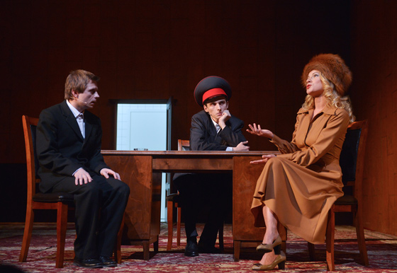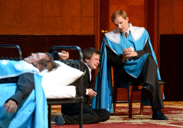 Весь звучащий в «Мушкетерах» текст был написан режиссером в процессе репетиций, для драматурга Богомолова это почти дебют. Почти — потому что еще в апреле он поставил в Лиепае собственную пьесу «Мой бластер разрядился», к тому же еще со времен «Лира» инсценировки Богомолова серьезно расходятся с первоисточником. Фирменным приемом режиссера долгое время оставалась выводящаяся на экран режиссерская ремарка, своего рода театральный аналог интертитров. Казалось бы, с приметами литературного стиля Богомолова публика знакома так же хорошо, как и с его режиссурой: ирония, черный юмор, абсурд и гротеск, смешение эпох и культур — «На Руси шел 1597 год, а в Польше в это время проходил фестиваль “Сопот-1979”» (это из прошлогоднего «Бориса Годунова» в «Ленкоме»). «Мушкетеры» позволяют увидеть Богомолова-драматурга в полный рост — и это, конечно, отдельный, вполне самостоятельный сюжет мхатовской премьеры.