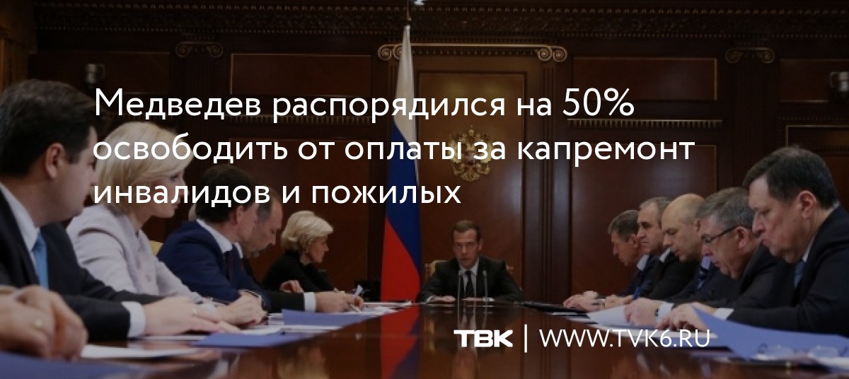 «Кроме того, правительство намерено рекомендовать регионам установить льготы для одиноко проживающих старше 70 лет, а именно компенсировать им расходы на оплату взносов на капитальный ремонт в размере 50%, для тех же, кому исполнится 80 и более лет, должна быть предусмотрена 100% компенсация», – сказал Медведев.