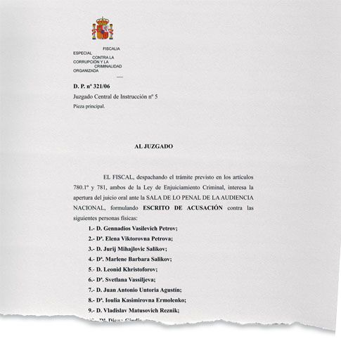 Дело № 321/2006, известное как дело «русской мафии в Испании», передано в уголовную палату Национального суда Испании в Мадриде. «Группировка интегрирована в полицейские институты России», — говорится в обвинении. The New Times прочитал обвинительное заключение, поговорил со следственным прокурором и выяснил подробности и перспективы уголовного дела
