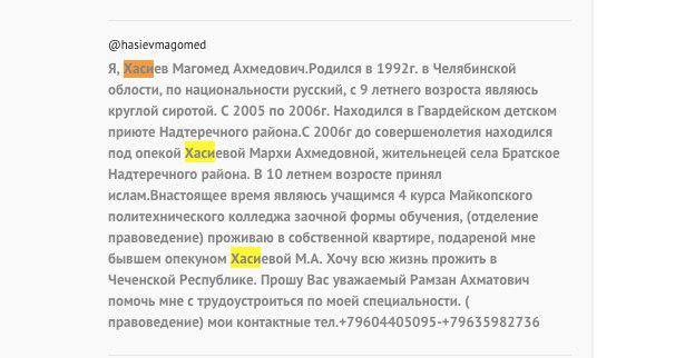 На видео Хасиев говорит, что он учился в Майкопе, жил в Старопромысловском районе Грозного, на улице Библиотечной. Корреспонденту Радио Свобода удалось найти профиль Хасиева в социальной сети "ВКонтакте". На одной из фотографий в этом профиле – действительно тот же человек, что и на видео. Комментарий Хасиева, в котором он сообщает, что родился в Челябинске и просит помощи у Рамзана Кадырова, можно найти под одной из записей 2013 года в аккаунте главы Чечни в инстаграме: