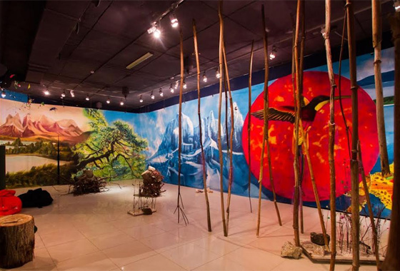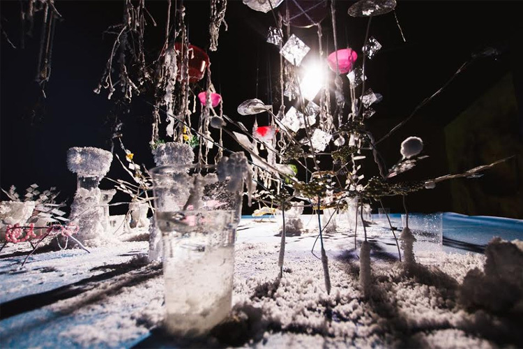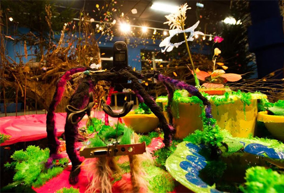 Впрочем, смотреть в окна совсем не обязательно. Все пространство второго этажа обжито инсталляциями-обманками. Художники создали особую среду, где искусственное переплетено с естественным. Гигантские «звезды» из высушенных стеблей борщевика. Камни, деревья, соляные инсталляции — но уже кислотных цветов. Их населяют фантастические растения и причудливые насекомые, сделанные из конфет, оберток, сломанных ТВ-пультов, компьютерных и телефонных останков. Органическое здесь прикидывается искусственным, а искусственное — органическим. Яркие цветы кажутся искусственными, но, подойдя поближе, понимаешь, что это не так. Природные оттенки, напротив, полностью искусственны и рукотворны.