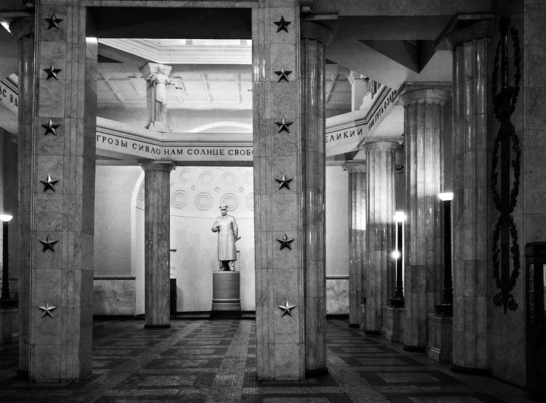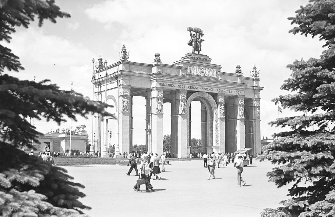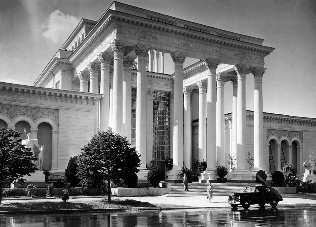 Павильоны метро и кинотеатры принимают облик античных храмов или открываются подобием триумфальных арок. Новые входы в Центральный парк культуры и отдыха имени Горького и на ВСХВ варьируют образ Бранденбургских ворот — памятника неоклассицизма конца XVIII века в центре побежденного Берлина. Молодые архитекторы штудируют теперь творения Росси, Бове, Кваренги. Кессоны на сводах, лавровые и цветочные гирлянды, композиции из знамен входят в стандартный репертуар декоративных элементов. Популярное название «сталинский ампир» вполне верно описывает архитектуру 1945-1955 годов.
