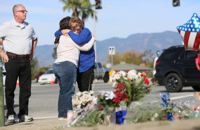 Люди пришли несут цветы в память о погибших, Сан-Бернардино, Калифорния, 5 декабря 2015
