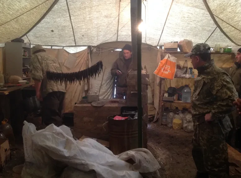 Передовой ВОП выглядит браво. Дорожка из пеньков, подобная той, по которой прыгал Янукович в Межигорье, ведет к армейской палатке. Пылает «буржуйка», работает телик и даже интернет, на стеллажах — макароны и соленья, на столе — показательные чайные кружки, у ног вертятся два котенка и собака.