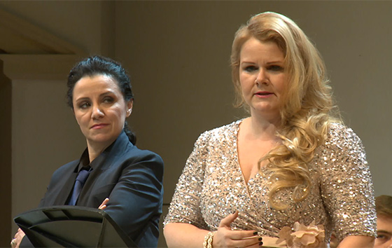 © Московская филармония Анна Бонитатибус и Биргитта Кристенсен Вообще редко такое бывает, но практически ни к чему невозможно предъявить претензии. Императорский тенор Сергея Романовского аристократично чеканил гуманные решения Тита Флавия Веспасиана. В дивном дуэте сливались высокие голоса Анжелы Валлоун и Оливии Фермойлен, изображавших вовсе не двух женщин, а разнополую пару влюбленных — Сервилию и Анния. Интриганка Вителлия, в конце концов исправившаяся и оценившая любовь Секста, пережила выразительное перевоплощение в исполнении Биргитты Кристенсен. Надежный Олег Цыбулько был на месте в партии Публия, наставника Тита. Хоровые эмоции народа Рима легко и радостно озвучивал вокальный ансамбль Intrada Екатерины Антоненко. Шесть солистов-певцов дополнял солист-инструменталист: Валентин Азаренков дважды выходил на авансцену со своего последнего ряда в оркестре, чтобы в дуэте с Секстом, а потом с Вителлией вдумчиво сыграть облигатные партии кларнета и бассетгорна.