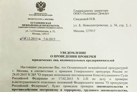 Кроме того, гендиректору «Дождя» направлено требование прокурора, в котором сообщается, что проверка проводится «по обращению граждан».