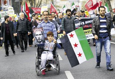 Антироссийская демонстрация сирийской оппозиции в Стамбуле: впереди 12-летний Мохаммед из Алеппо, который в результате российской бомбардировки потерял ногу,Турция, 27 ноября 2015 года