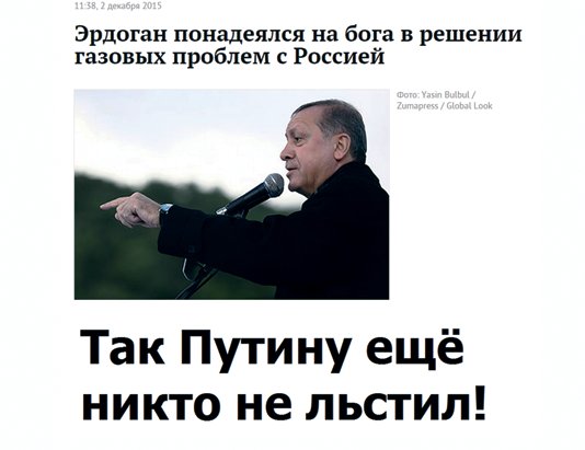 Владимир Путин на таких картинках — олицетворение силы: он бежит за Эрдоганом со снайперской винтовкой либо вовсе не присутствует, но упоминается. «Так Путину еще никто не льстил» — гласит остроумный комментарий на демотиваторе с принтскрином новости «Ленты.ру» о том, что Эрдоган надеется в решении газового вопроса с Россией «на Бога».