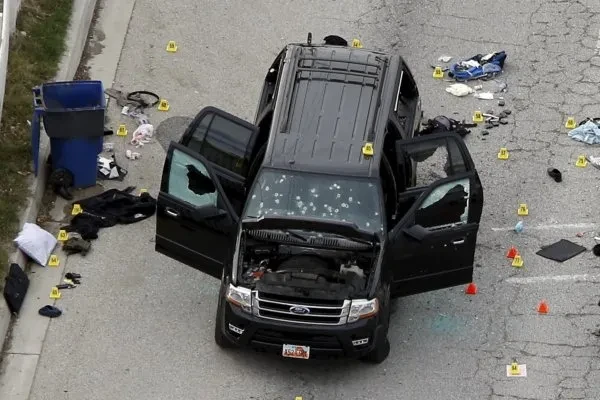 Вооруженная полуавтоматами, одетая в спецформу с прикрепленными на ней боеприпасами, супружеская пара открыла стрельбу, убив 14 человек (в возрасте от 26 до 60 лет), ранив17 и еще оставив в здании игрушечный автомобиль с дистанционным управлением, начиненный тремя самодельными взрывными устройствами, которые, к счастью, не взорвались.