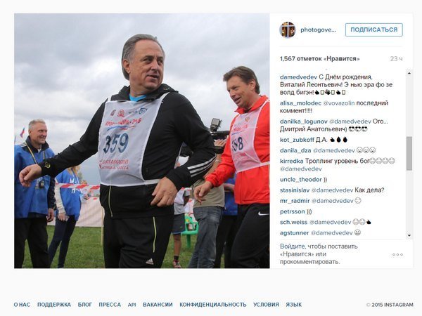 Глава российского правительства Дмитрий Медведев поздравил министра спорта России Виталия Мутко с днем рождения. В поздравлении, опубликованном в инстаграме правительства, Медведев процитировал первую речь Мутко, произнесенную на английском языке.
