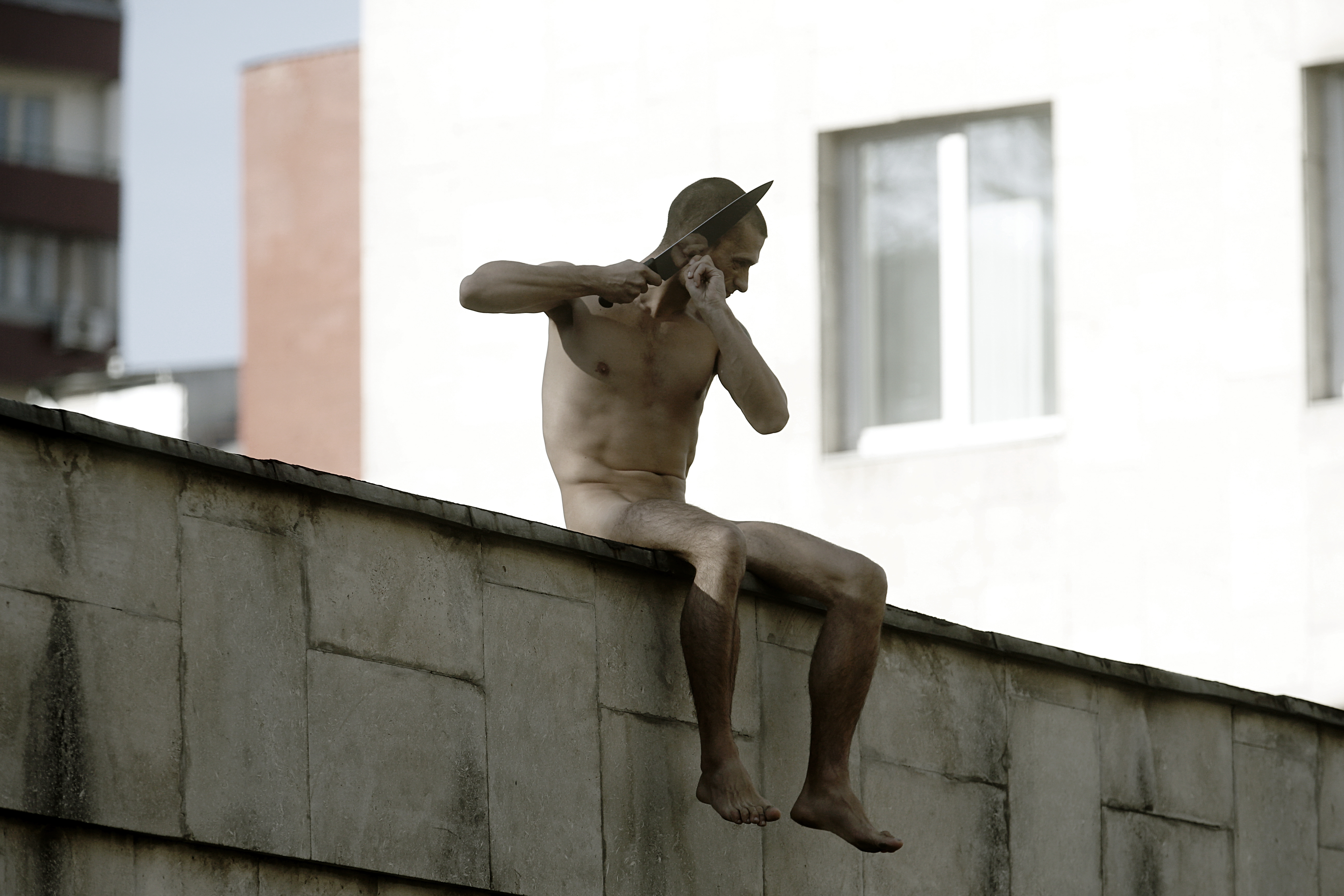Олег Кулик: Я видел все эти нью-йоркские перформансы, о которых говорит Милена – просто стошнит от 99%. Все в основном костюмированные, чистая театральщина. Но когда я увидел этот перформанс и фотки... Он еще висел на этой проволоке – это вообще невероятно: не просто терновый венец, а вот так на себя намотать… При этом было абсолютно эстетическое ощущение, казалось, что ему не больно. Мне кажется, это очень сильно заостряет старую технику. То ли он бесчувственный, то ли он настолько чувствительный, что работает только с социальной реальностью… И даже интересно прогнозировать его неудачи. Приехал он в Киев поджигать колеса и всем там мешал, там серьезные баррикады, серьезная борьба, его оттуда просто прогнали – чуть ли не поварешками.