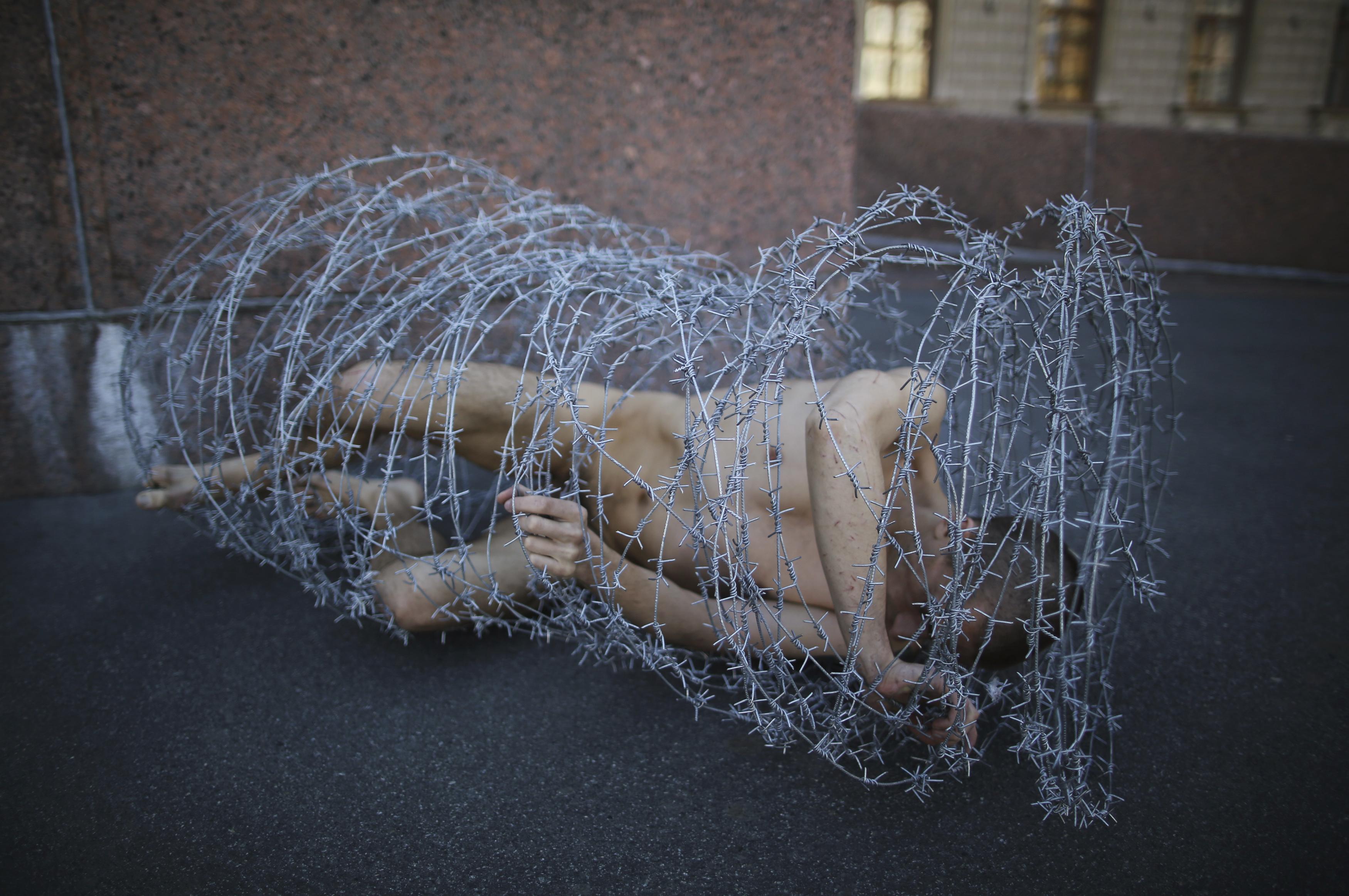 Сергей Медведев: Действительно, всплывает образ народников. Павленский отрезает мочку собственного уха, сидя на заборе Института Сербского, оборачивает себя колючей проволокой… Мне кажется, сейчас очень важно то, что он перешел от собственной крови к действиям политическим, направленным против Левиафана – к двери КГБ. Эта акции настолько актуальна… За месяц, прошедший после этой акции, практически ежедневно приходят шокирующие новости из российских колоний, СИЗО, УВД. По-моему, в Перми в колонии надзиратели распяли заключенного, но не прибивали, а просто привязали в форме креста, и заключенные в качестве протеста зашили себе рты. То, что сделал Павленский, буквально вырвано из самой гущи повседневности.