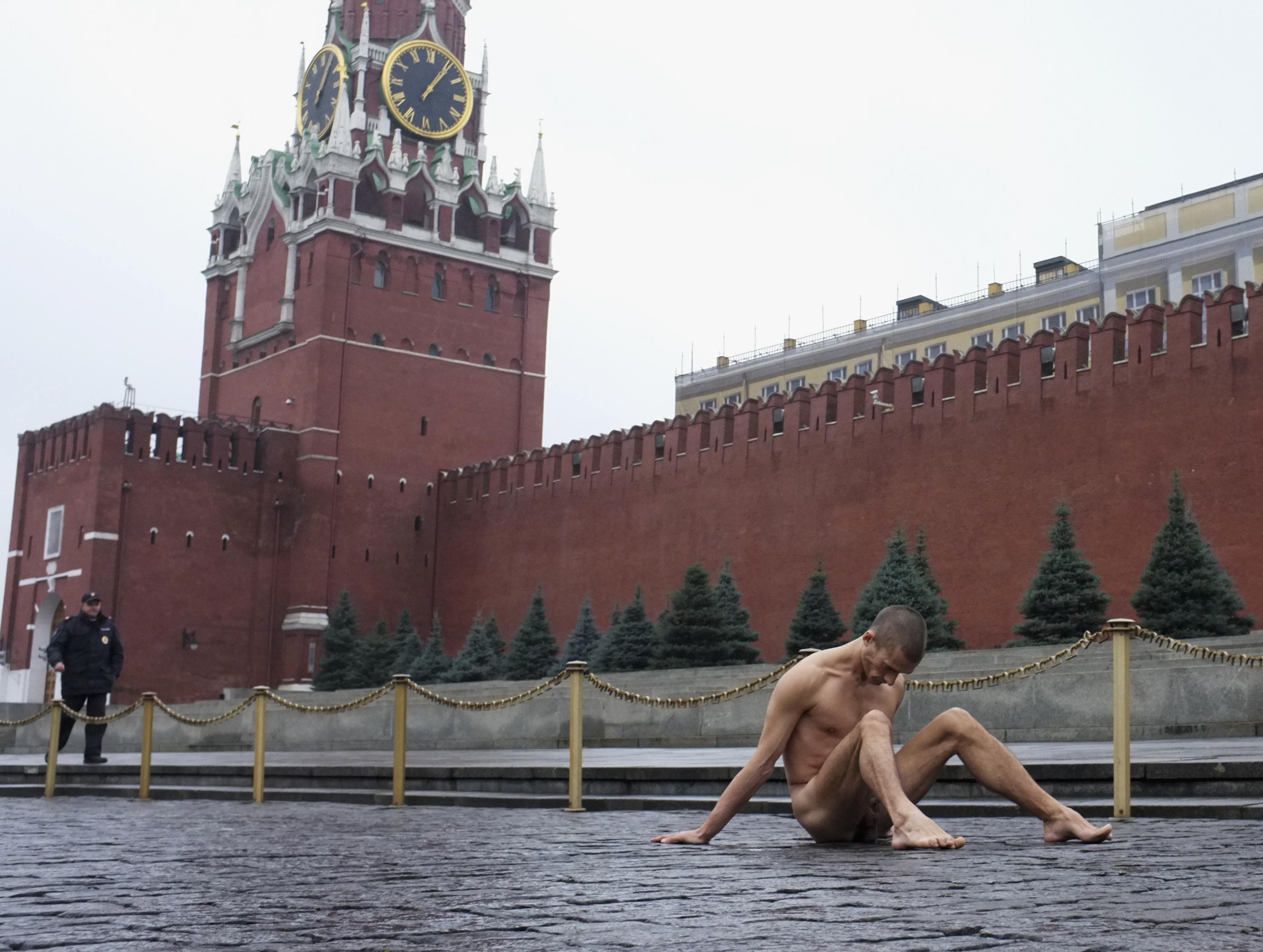Олег Кулик: Есть такие же прецеденты, которые иногда плохо заканчивались. В Индии сжигают себя в храмах, но это не позиционируется как искусство. Каждую акцию надо разбирать конкретно. В каждой акции важно, насколько человек просчитывает или не просчитывает результат. Саша Бренер, например, когда бросал банки с кетчупом в белорусское посольство после того, как они сбили каких-то парашютистов, реально не рассчитывал, ему просто надо было дойти с этими бутылками. Он подошел, встал и швырнул. Выбежали два полицейских, так дубасили его – аж ногти слезли. Это видео настолько не художественное, настолько сильное… Это очень страшная сцена. Но это снимал действительно случайный человек – издалека. И современные художники сильно переместили все это в медиа, а Петя это делает просто как штудию, как он рисовал бы со студентами: я буду стоять тут, ты – тут, подойдем к кремлевским воротам, Путин будет выезжать, я сделаю вот так, и это, может, удастся. В этой России может удаться такой странный, единственный, абсурдный художественный жест.