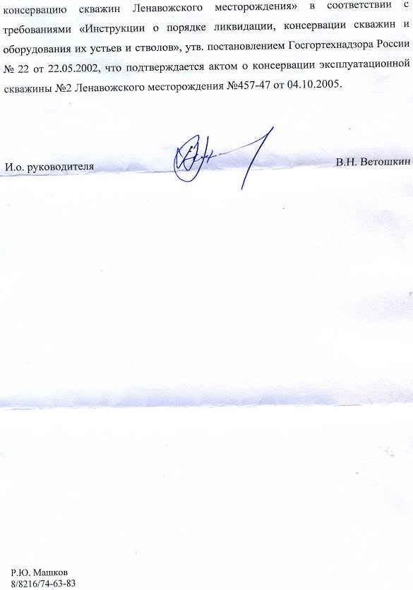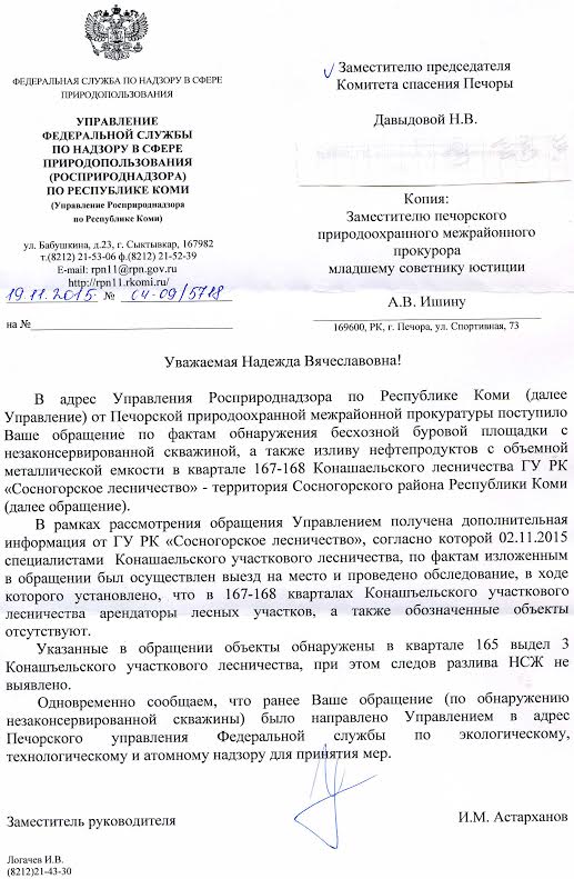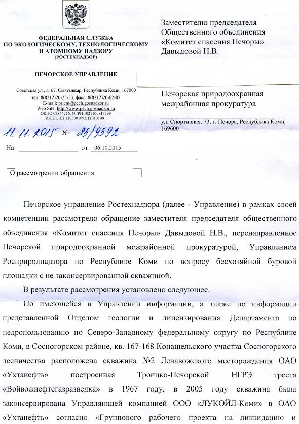 Комитет спасения Печоры обратился в Печорскую природоохранную межрайонную прокуратуру с заявлением аналогичного содержания (за исключением вопросов веры), те по подведомственности передали в Росприроднадзор. Участок попадает в границы одного из месторождений, но не попадает в границы лицензионных участков. То есть, как бы ничей? Думаю, что то подобное в перспективе ждёт ныне разрабатываемые месторождения.