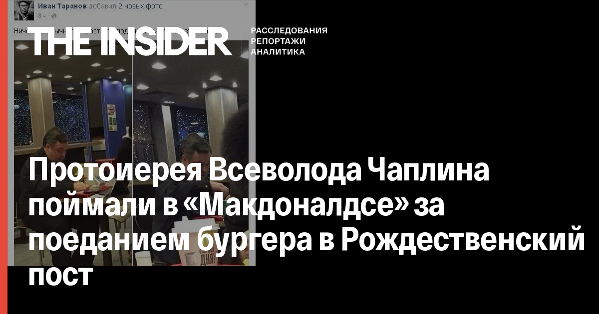 Всеволода Чаплина сфотографировали с бургером в «Макдоналдсе». В фейсбуке появились снимки, на которых видно, как глава синодального отдела РПЦ трапезничает в американском кафе. Фото, на которых видно, как Чаплин ест бургер и пьет кофе в «Макдоналдсе», опубликовал пользователь под именем Иван Таранов. «Ничего необычного, просто господин Чаплин ужинает в маке», — написал он в описании фотографии. Рождественский пост у православных христиан начинается 28 ноября и длится 40 дней — до 7 января. Пост предполагает отказ от мяса, молока, яиц, а в последние дни поста — рыбы и растительного масла.