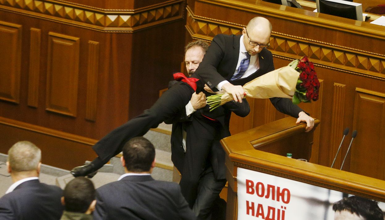 On Friday, December 11, a fight broke out on the floor of the Ukrainian parliament. Oleg Barna, a deputy in President Poroshenko's bloc approached the speaker's podium, where Prime Minister Arseniy Yatsenyuk was delivering an address. Handing him a bouquet of roses, Barna started shoving Yatsenyuk, then tried to carry him away, even grabbing him between the legs and lifting him into the air. Immediately, several other deputies intervened and a mass brawl began. Neither Yatsenyuk nor his roses took part.