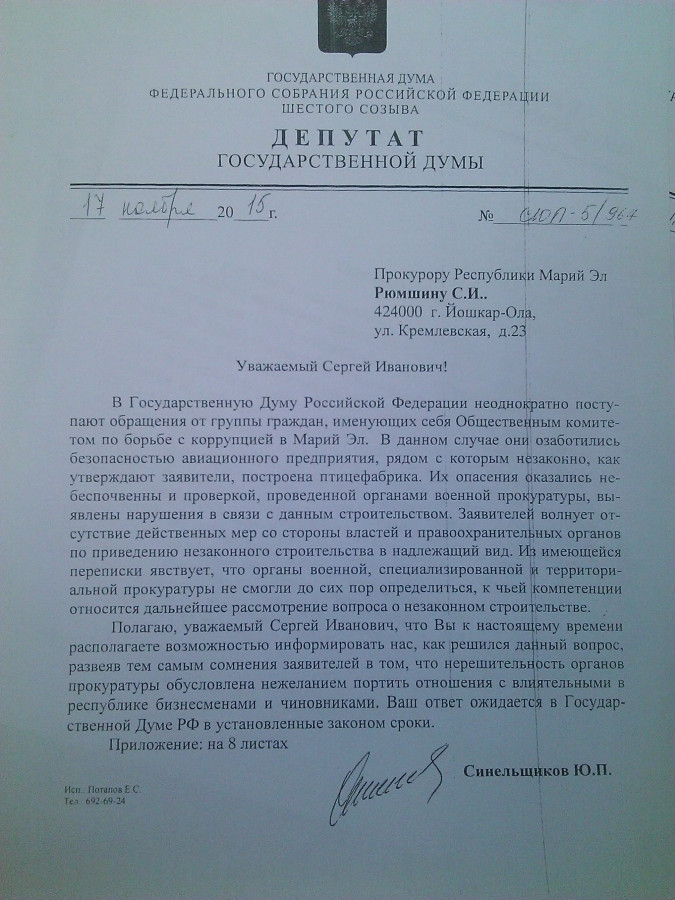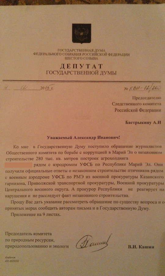 Депутаты Государственной Думы направили официальные запросы в Следственный комитет России и Прокуратуру Марий Эл по вопросу незаконного строительства 280 тыс. кв. метров птичников крупнейшего в республике агрохолдинга рядом со стратегическим объектом – военным аэродромом УФСБ по Марий Эл. Авторами запросов являются известные и влиятельные депутаты Госдумы Владимир Кашин и Юрий Синельщиков.