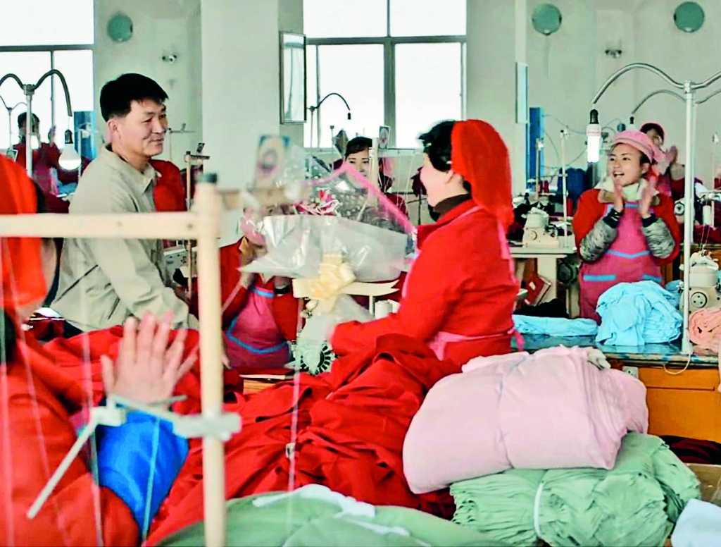 Съемка на образцово-показательной швейной фабрике. Мужчина в кадре — отец Зин Ми, как бы инженер. В фильме два дубля этой сцены: в первом работница докладывает, что план перевыполнен на 150%, сопровождающий ее останавливает