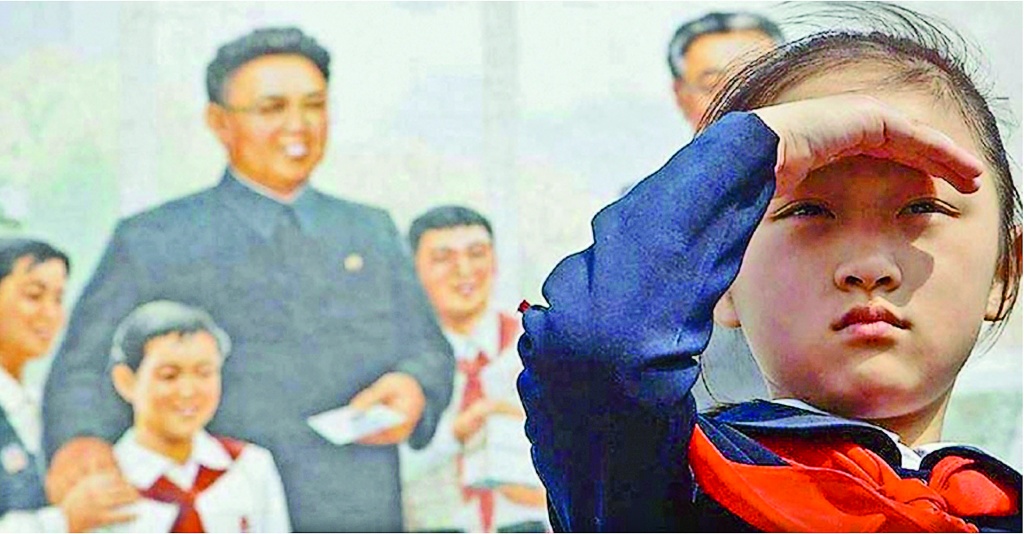 Главная героиня фильма — 8-летняя Зин Ми на фоне северокорейской версии «Любимый вождь и дети»